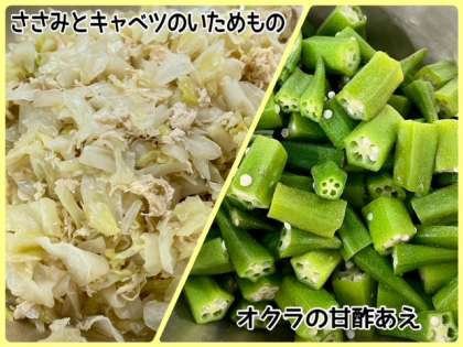 「オクラの甘酢あえ」は、焼き物機で蒸したオクラに砂糖、塩、米酢、うすくちしょうゆで作ったタレををかけ、あえています。