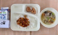 明日の献立は、酢豚・中華みそスープ・まっ茶大豆・ごはん・牛乳です。