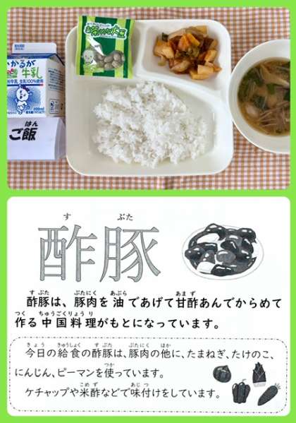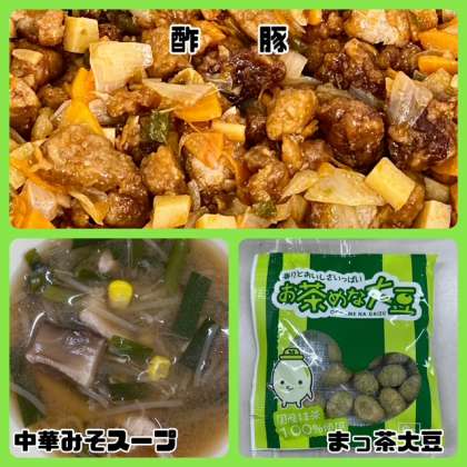 ?今日の献立は、酢豚・中華みそスープ・まっ茶大豆・ごはん・牛乳でした。