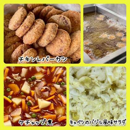 ??今日の献立は、チキンレバーカツ・ケチャップ煮・キャベツのバジル風味サラダ・黒糖パン・牛乳でした。