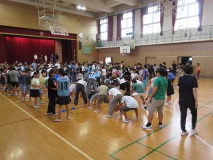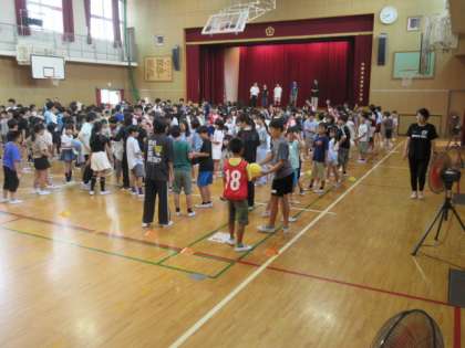 今日の集会は「ボール送りゲーム」。それぞれの班が1列になり、ボールを後ろの人に手渡したり、次の人の足と足の間にボールを入れて渡したりして、いち早くボールを送るゲームです。ルールを理解した後は、ボール送りがスムーズになり、盛り上がっていました。