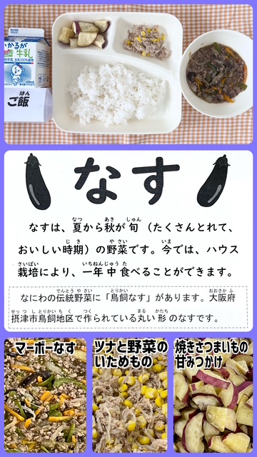 ?今日の献立は、マーボーなす・ツナと野菜のいためもの・焼きさつまいもの甘みつかけ・ごはん・牛乳でした。