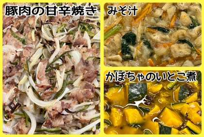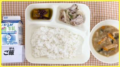 ?今日の献立は、豚肉の甘辛焼き・みそ汁・かぼちゃのいとこ煮・ごはん・牛乳でした。