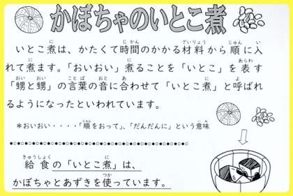 「かぼちゃのいとこ煮」は、だしで煮上げたかぼちゃに砂糖、みりん、うすくちしょうゆで味つけし、ドライパックのあずきを加えて煮ています。今日のかぼちゃは、北海道産です。