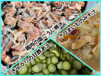 今日の献立は、?鶏肉の塩こうじ焼き・さつまいものみそ汁・きゅうりの甘酢あえ・ごはん・牛乳でした。