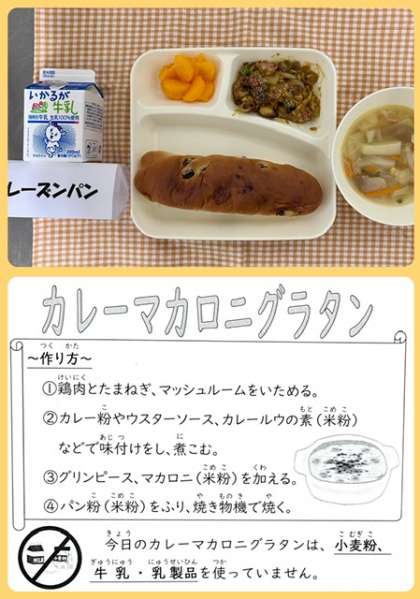?今日の献立は、カレーマカロニグラタン・豚肉と野菜のスープ・みかん(缶)・レーズンパン・牛乳でした。