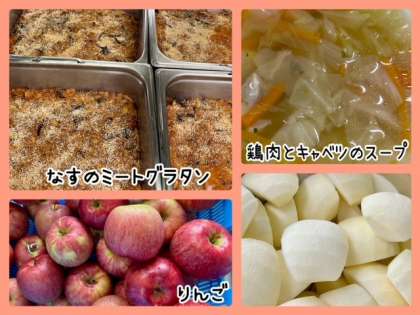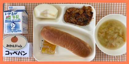 ?今日の献立は、なすのミートグラタン・鶏肉とキャベツのスープ・りんご・コッペパン・みかんジャム・牛乳でした。