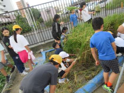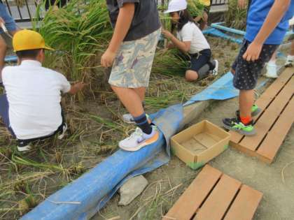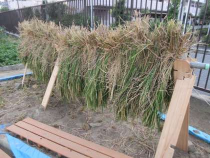 刈り取った稲は、お手伝いの子ども達や先生方で干しています。