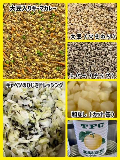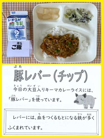 「大豆入りキーマカレーライス」は、牛ひき肉、豚ひき肉、鉄が豊富に含まれている豚レバー(チップ)、大豆(ひきわり)などを使用しています。
