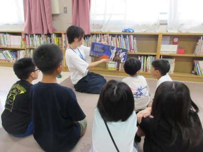 今日は、20分休みの図書館開放の時間に読み聞かせをしていただきました。読んでいただいた本は、ハロウィンが近づいてきた時期にちなんだ「おおきなかぼちゃ」でした。参加した子ども達は、写真のように静かに聞き入っていました。