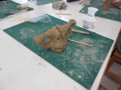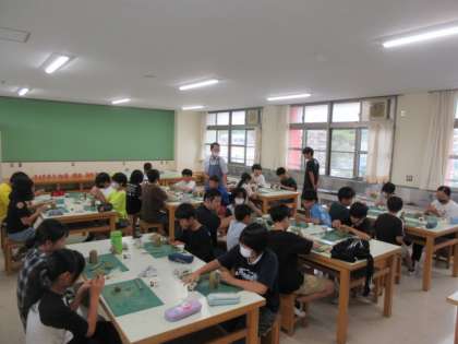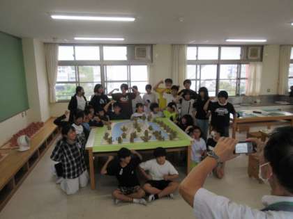 それぞれが思い思いの「はにわ」を制作しています。最後は、出来上がった作品を前方後円墳の台紙の上に置いて、記念撮影をしました。