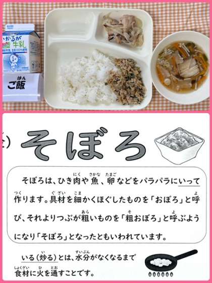 ?今日の献立は、鶏肉のゆず塩焼き・ソーキ汁・ツナ大豆そぼろ・ごはん・牛乳でした。