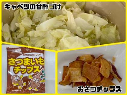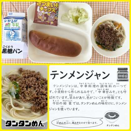 ?今日の献立は、タンタンめん ・ キャベツの甘酢づけ・おさつチップス・黒糖パン・牛乳でした。