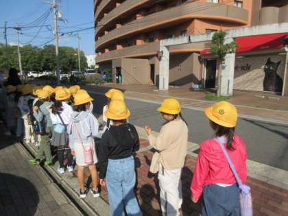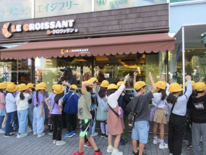 2年生は、生活科「町たんけん」の学習に向け、焼野小学校の校区内にはどのようなお店や施設があるのかについて、歩いて周りました。「このお店行ったことある」「この辺りは家が多いなあ」などと話しながら校区の様子をつかんでいました。