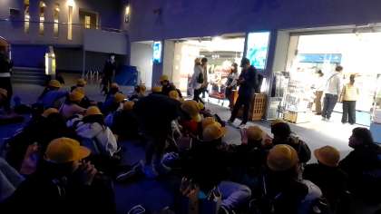 水族館での見学・昼食・土産購入を終え、集合しています。