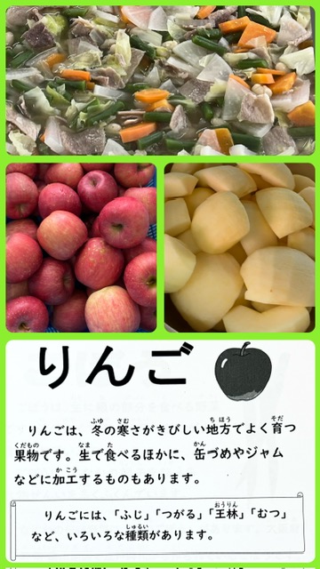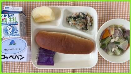 ?今日の献立は、ほうれんそうのグラタン・てぼ豆のスープ煮・ りんご・コッペパン・ブルーベリージャム・牛乳でした。