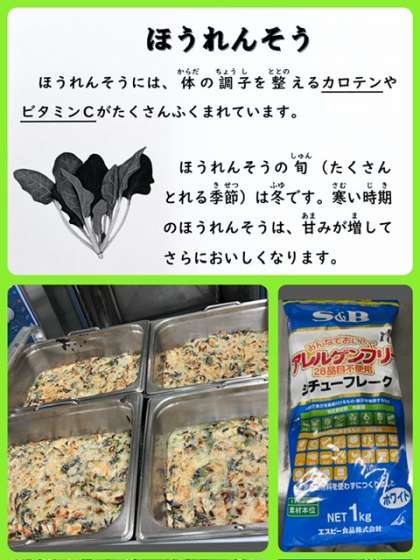「ほうれんそうのグラタン」は、冷凍のほうれんそう、鶏肉などを使用しています。シチュールウの素などで味つけし、上新粉でとろみをつけています。乳、小麦を使用しないため、乳、小麦アレルギーの児童生徒も食べることができます。