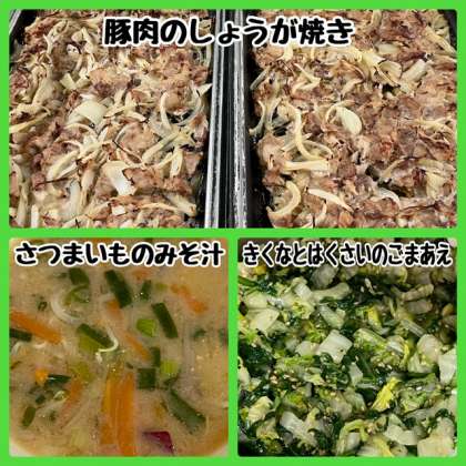 ?今日の献立は、豚肉のしょうが焼き・さつまいものみそ汁・きくなとはくさいのごまあえ・ごはん・牛乳でした。