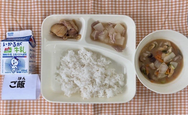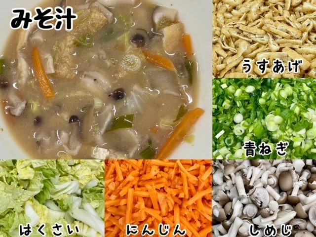「みそ汁」は、うすあげ、はくさい、にんじん、しめじ、青みに青ねぎを使用しています。