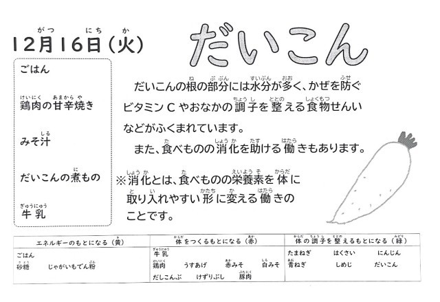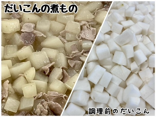 「だいこんの煮もの」は、冬が旬のだいこんと豚肉をだしで煮、みりん、うすくちしょうゆで味つけし、水どきでん粉でとろみをつけて仕上げます。