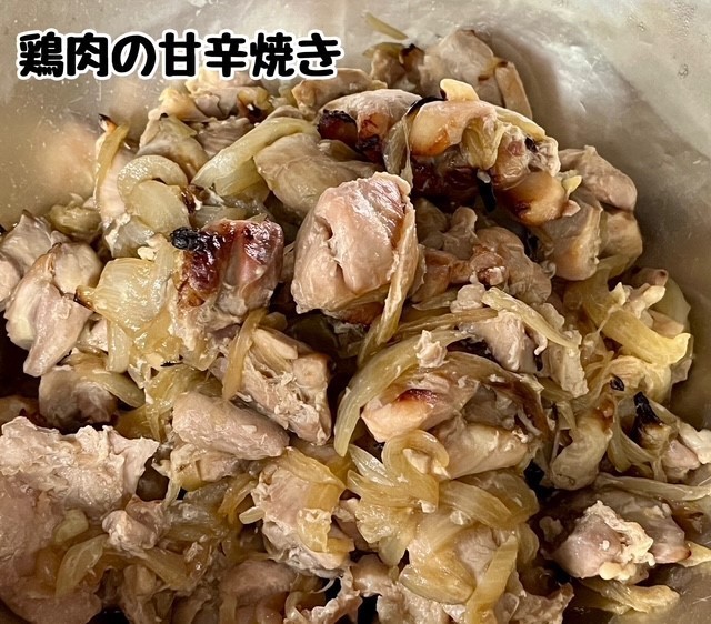 「鶏肉の甘辛焼き」は、鶏肉に料理酒、砂糖、みりん、こいくちしょうゆで下味をつけ、たまねぎを混ぜ合わせ、焼き物機で焼いています。