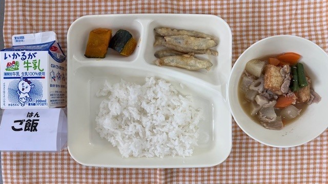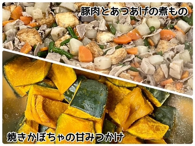 「豚肉とあつあげの煮もの」は、豚肉、あつあげ、だいこん、にんじん、れんこん、青みにさんどまめを使用しています。