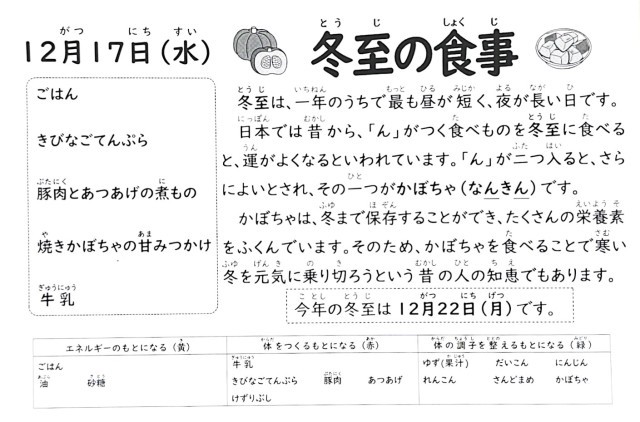 今年の冬至は、12月22日です。冬至にかぼちゃを食べると、かぜをひかずに健康に暮らせるといわれています。