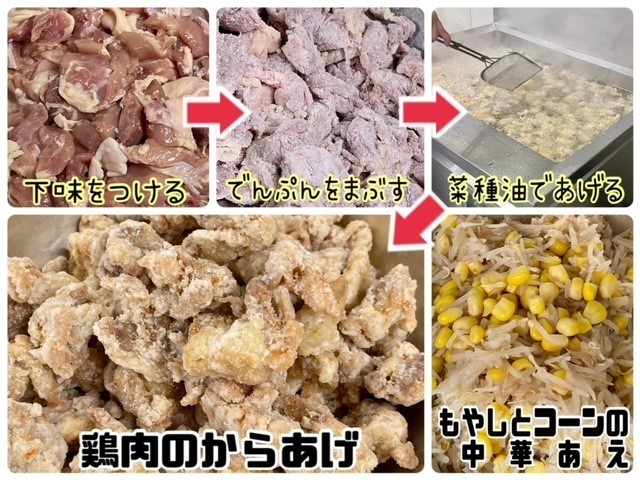 「鶏肉のからあげ」は、鶏肉にしょうが、にんにくなどで下味をつけ、でん粉をまぶし、油で風味よくあげています。今日は、約18㎏の鶏肉を使用しています。