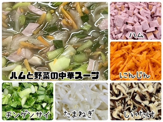 「ハムと野菜の中華スープ」は、ハム、たまねぎ、チンゲンサイ、にんじん、しいたけを使用し、塩、こしょう、うすくちしょうゆ、中華スープの素で味つけしています。