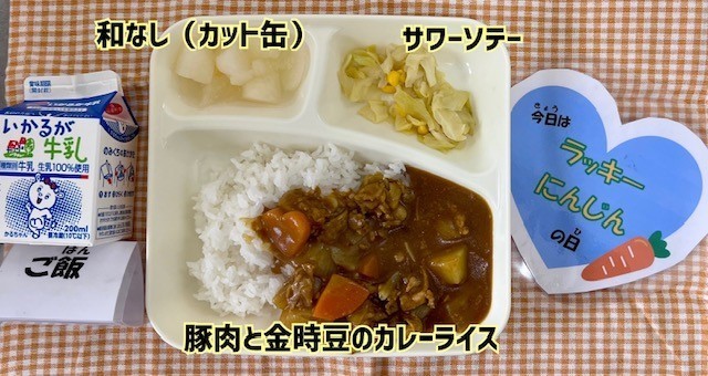 「豚肉と金時豆のカレーライス」は、豚肉、じゃがいも、金時豆(ドライパック)、たまねぎ、にんじんを使用したカレーライスです。カレーやシチューの日は、給食室でラッキーにんじんを作っていただいています。