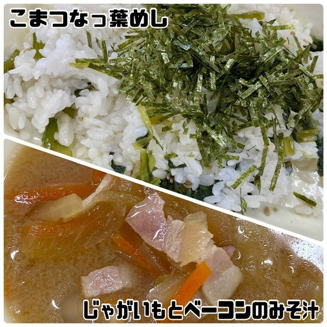 「こまつなっ葉めし」は、ゆでたこまつなをいため、砂糖、うすくちしょうゆで味つけし、最後にいりごまを加えます。配食時に盛り付けたご飯に添え、喫食時に「きざみのり」をかけて食べます。