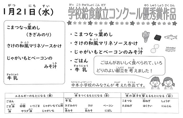 この献立は、令和6年度学校給食献立コンクール優秀賞に選ばれた献立です。児童が考えた献立のねらいは、「ごはんがおいしく食べられて、いろどりのよいこん立を考えました。」です。