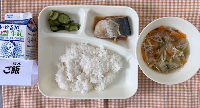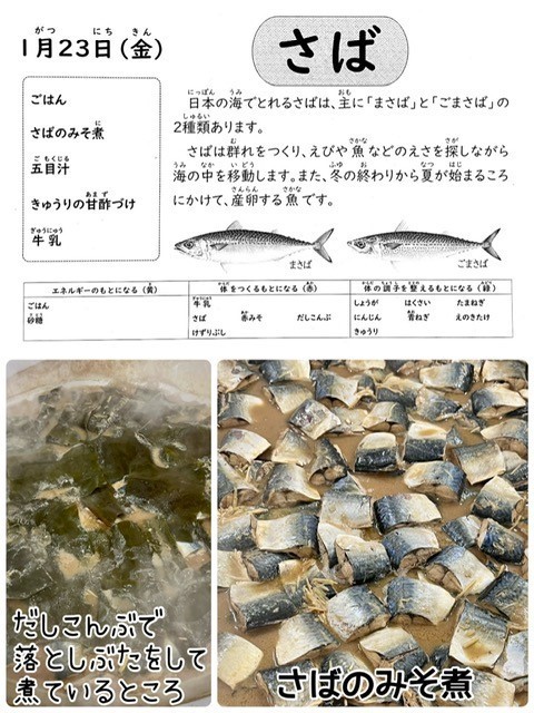 「さばのみそ煮」は、骨付きのさばを使用しています。しょうが、赤みそなどで煮含めることで、さばの臭みを消し、食べやすくしています。さばは、だしこんぶで落としぶたをして、中まで火が通るよう、しっかりと加熱します。さばを釜に入れる時に、給食調理員さんが一つ一つ皮目を上にして並べてくださったおかげで、身がくずれることなくきれいな「さばのみそ煮」が出来上がりました!