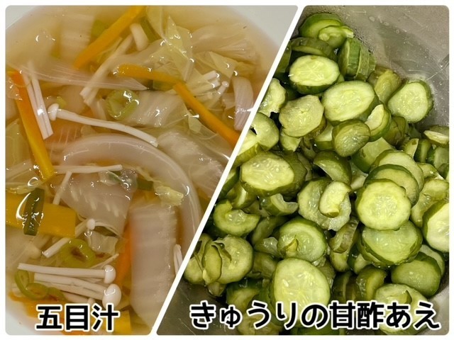 「五目汁」は、はくさい、たまねぎ、にんじん、えのきたけ、青みに青ねぎを使用しています。