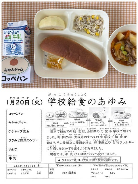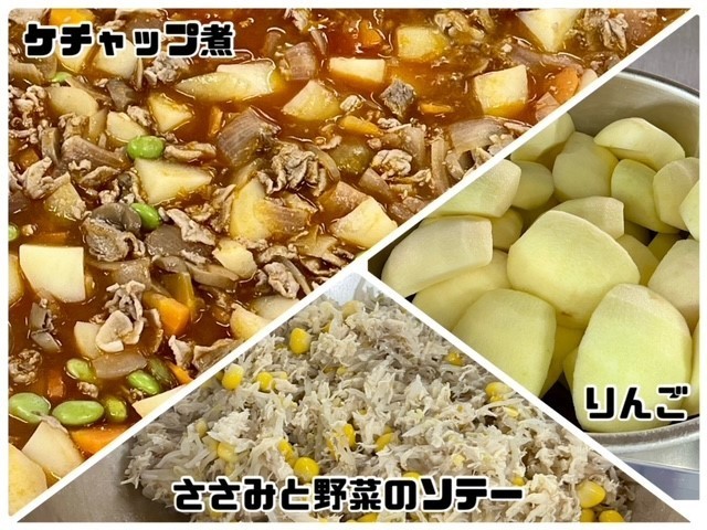 「ケチャップ煮」は、豚肉、じゃがいも、たまねぎ、にんじん、マッシュルーム、彩りにむきえだまめを使用し、ケチャップなどで味つけした煮ものです。この献立は、【大豆】の除去食に対応しています。