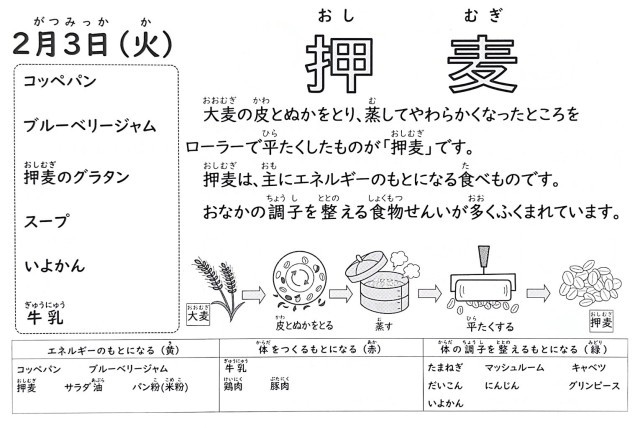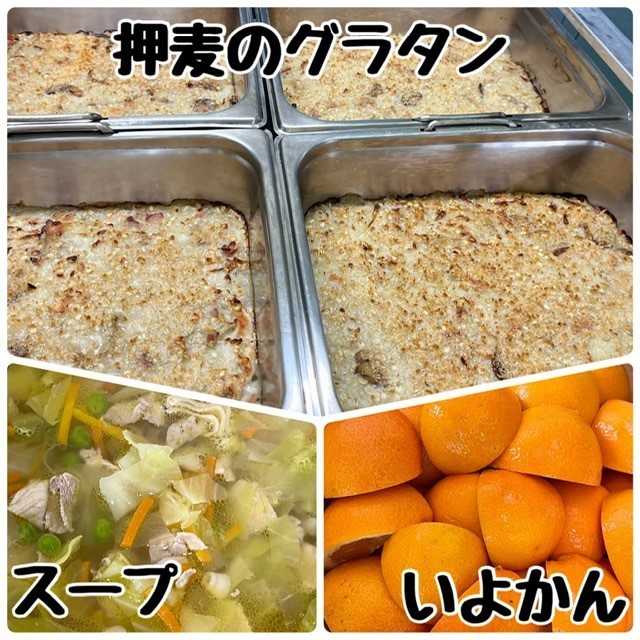 「押麦のグラタン」は、鶏肉と食物繊維が多く含まれる押麦、たまねぎ、マッシュルームを使用した乳・小麦を使用しないグラタンです。グラタンは、釜で調理したものをクラスごとにミニバットに分け入れ、焼き物機で焼き上げています。そのままふたをして教室まで運び、クラスで人数分に取り分けていただきます。