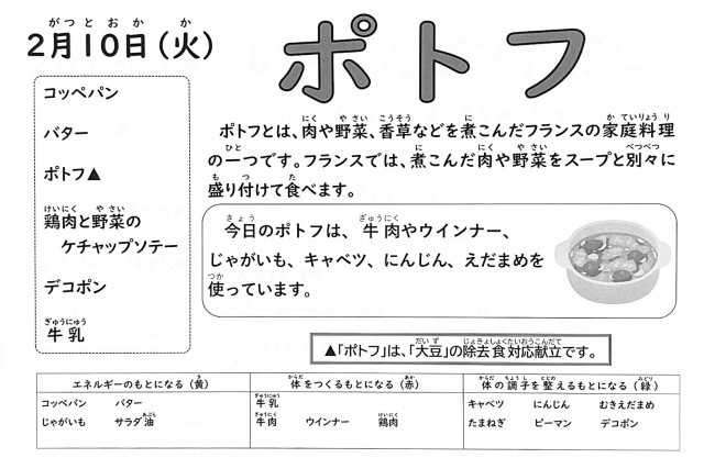 「ポトフ」は、肉や野菜をじっくり煮込んだフランスの家庭料理の一つです。牛肉(角・かたロース)、ウインナー、じゃがいも、キャベツ、にんじんを使用したボリュームのある煮ものです。青みにむきえだまめを使用しています。この献立は、【大豆(むきえだまめ)】の除去食に対応しています。