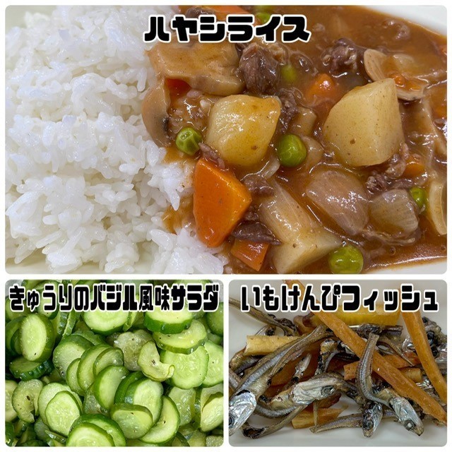「ハヤシライス」は、牛肉、じゃがいも、たまねぎ、にんじんなどを使い、水どき上新粉でとろみをつけ、調味料で味つけして煮込んでいます。今日も給食室でラッキーにんじんを作っていただきました。