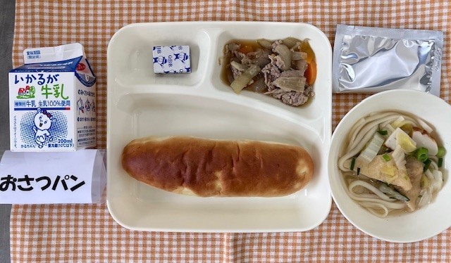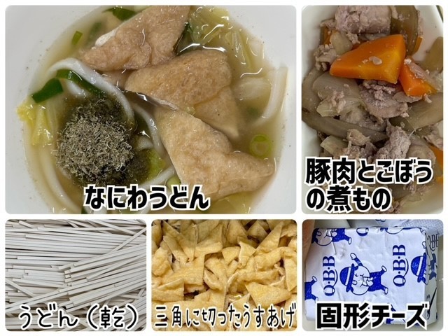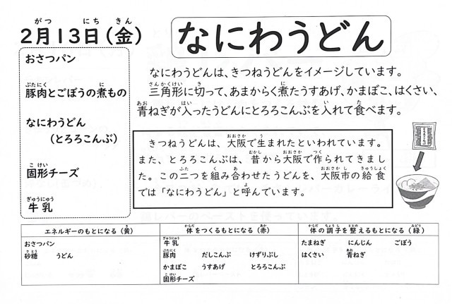 「なにわうどん」は、1/16の三角に切ったうすあげを焼き物機で煮ています。かまぼこ、はくさいと青みに青ねぎを加え、だしの旨みを味わうことのできるシンプルなうどんに仕上げています。教室で配食後、とろろこんぶを1人1袋入れていただきます。