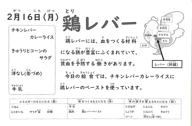 「チキンレバーカレーライス」は、不足しがちな鉄を補うことを目的に、鶏レバー(ペースト)を使用しています。鶏レバーの臭みをおさえるために、みじん切りのしょうがを使用しています。