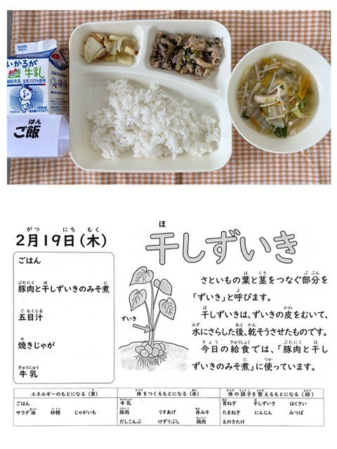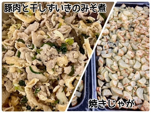 「豚肉と干しずいきのみそ煮」は、豚肉、うすあげ、青ねぎ、干しずいきを使用し、砂糖、みりん、こいくちしょうゆ、赤みそで味つけした煮ものです。干しずいきはさといもの葉柄(ようへい)のことで、カルシウムや鉄、食物繊維が多く含まれます。昔から食べられてきた乾物の一つとして、児童生徒に伝えていきたい食材です。