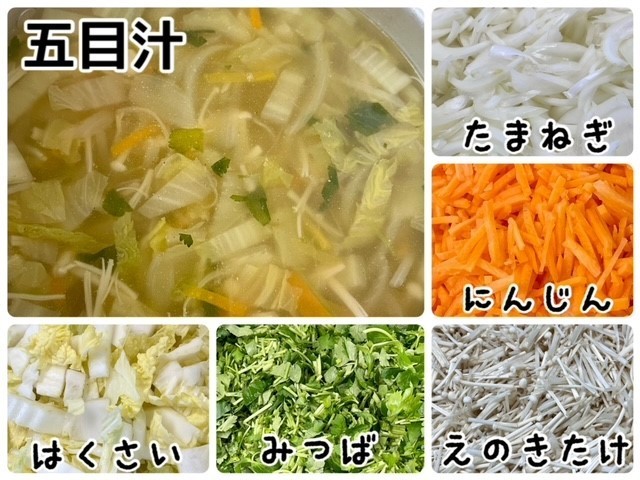 「五目汁」は、鶏肉、はくさい、たまねぎ、にんじん、えのきたけ、青みにみつばを使用しています。