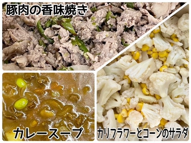 「カリフラワーとコーンのサラダ」は、カリフラワーとコーンを各々ゆで、砂糖、塩、米酢、うすくちしょうゆ、綿実油で作ったドレッシングをかけ、あえたものです。