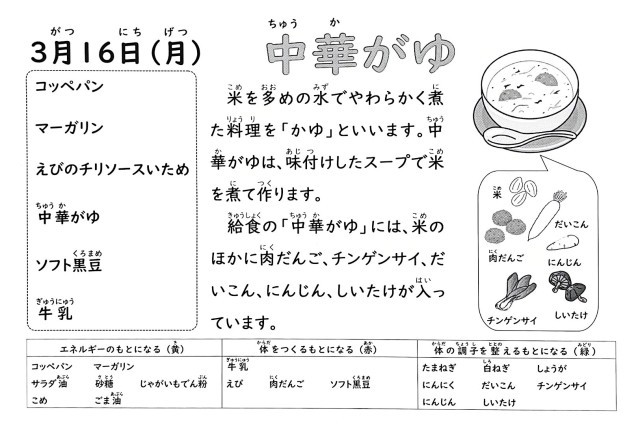 「中華がゆ」は、肉だんごを使った児童生徒に好評な献立です。だいこん、にんじん、しいたけ、青みにチンゲンサイを使用しています。ごま油を使用することで中華らしさを出しています。