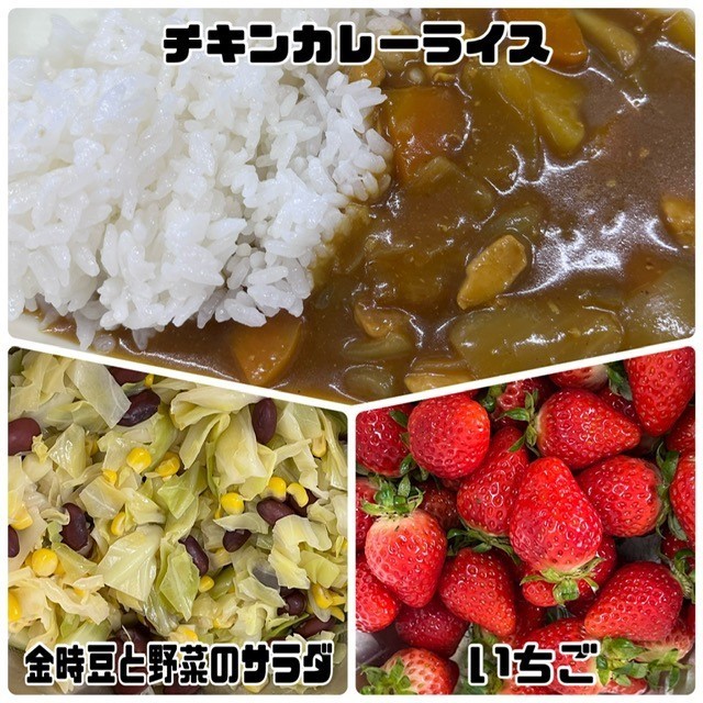 「チキンカレーライス」は、鶏肉を主材にした児童生徒に好評なカレーライスです。ラッキーにんじん