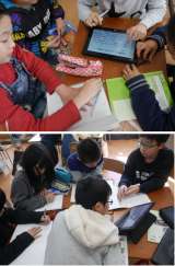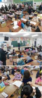 3時間の授業後には、作品展を子どもと一緒にみようとたくさんの保護者の方にきてい...