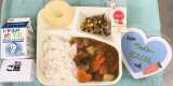 今日の献立は、牛肉(近江牛)と金時豆のカレーライス・ごぼうサラダ・パインアップ...
