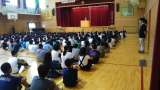 全児童が集合して、集会委員会が考えたクイズ「間に通るものな〜んだ」をたて割り班...