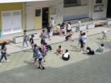 梅雨の晴れ間を利用して、4年生が光電池を使ったソーラーカーを走らせる実験を中庭...
