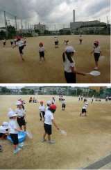 1年生が生活科の「夏だあそぼう」の学習でシャボン玉遊びをしました。うちわの骨を...